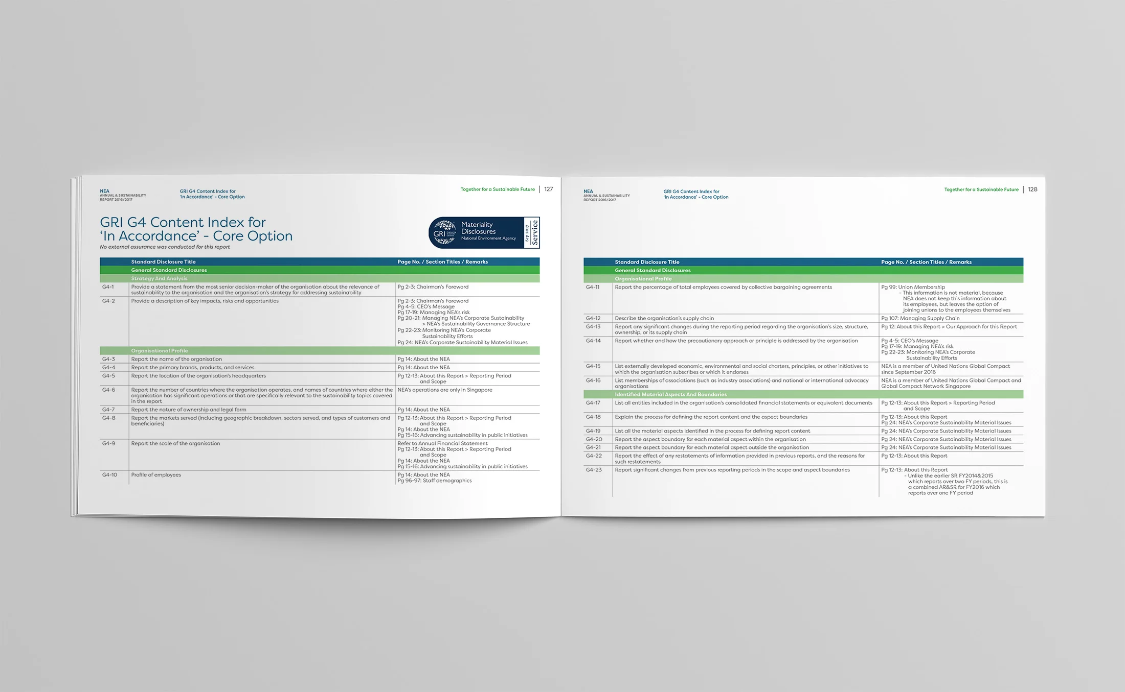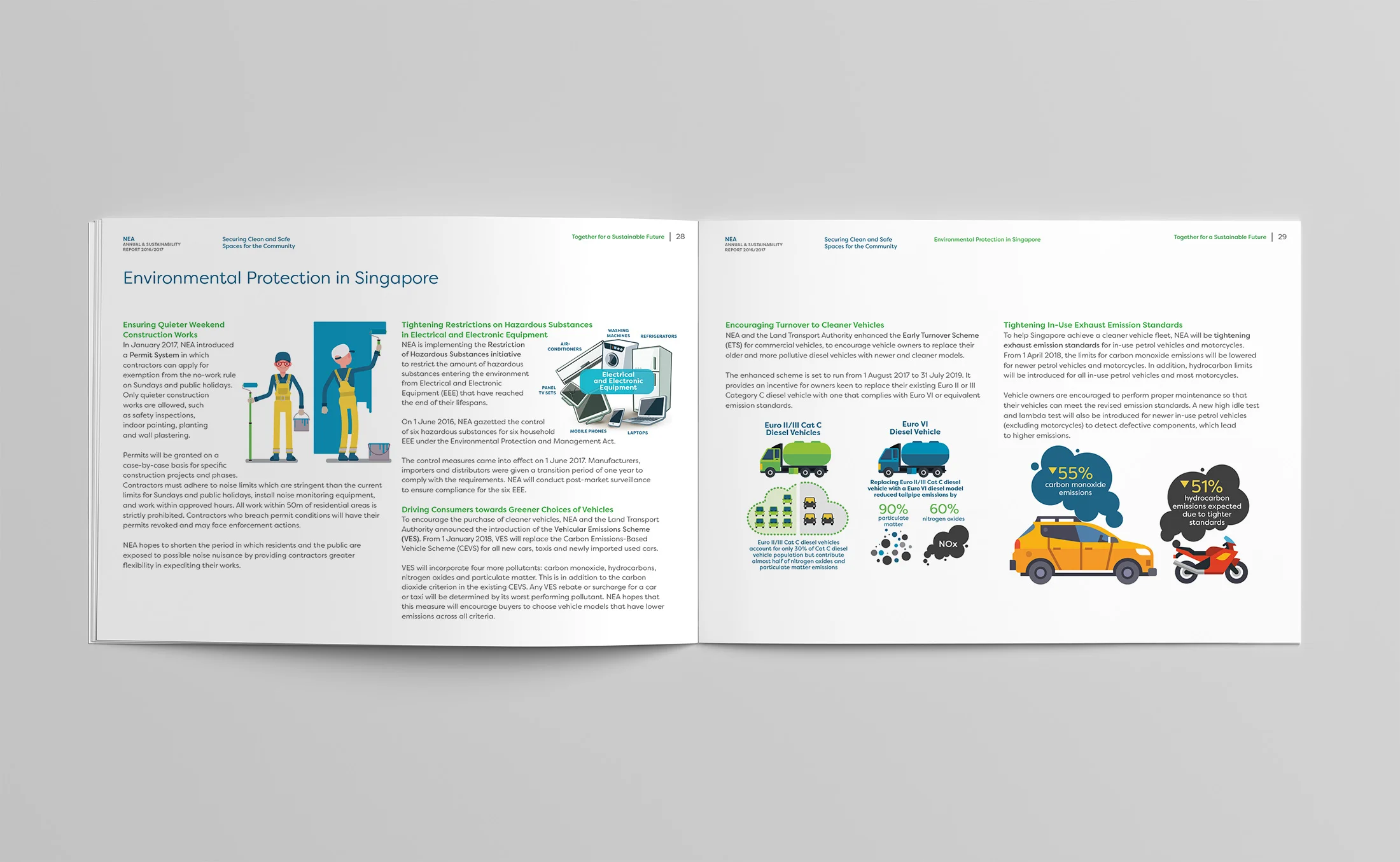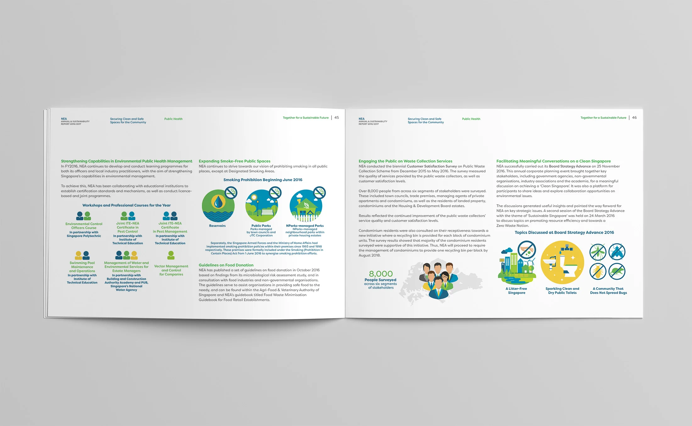 Leap took on full creative and production responsibilities for the NEA Annual and Sustainability Report 2016/2017 — overseeing art direction, photography, copywriting, infographics, and print coordination. A systematic content workflow was critical: content was gathered, written, structured, and designed concurrently across multiple teams without compromising accuracy or quality.